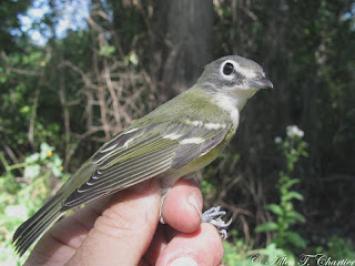 Highlights of birds banded on Wednesday, September 15 included 7 Ruby-throated Hummingbirds and three species caught for only the second time this fall, single Northern Flicker, Eastern Wood-Pewee, and Rose-breasted Grosbeak. The first Blue-headed Vireo of the season was a nice catch, though it didn't cooperate very well for photos.