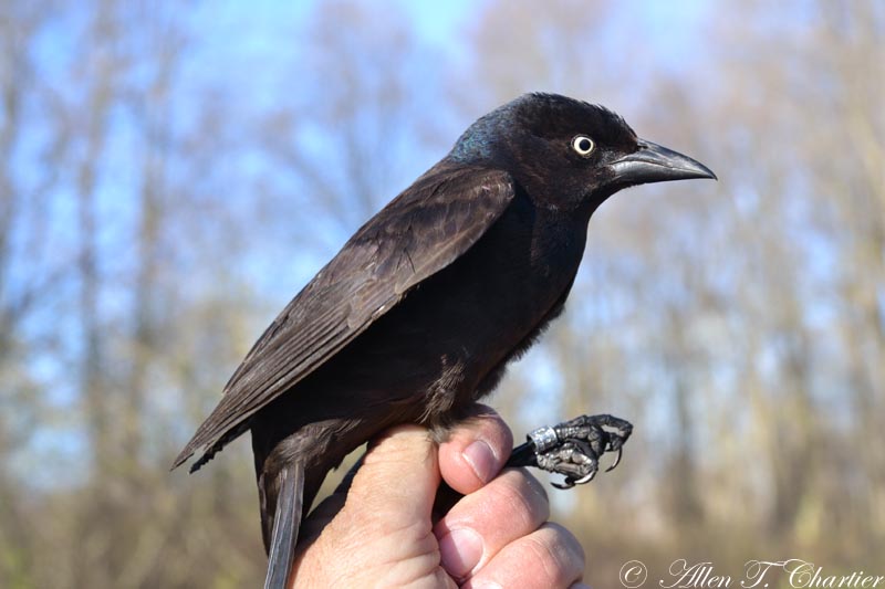 The first of probably many Common Grackles was banded today. This one is a second-year female and is rather duller than most people expect for the species this time of year. It has retained much of its duller, non-iridescent underparts and females have smaller tails than males as well as smaller bills. I wouldn't be surprised if individuals like this are mistakenly identified at feeders as Rusty Blackbirds or even Brewer's Blackbirds.