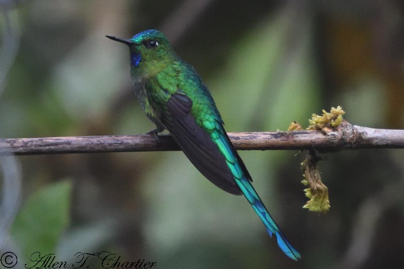 Some field guides illustrate their long tail feathers as being green, but clearly they are blue, and I've never seen them appear green when I've seen them in Ecuador.